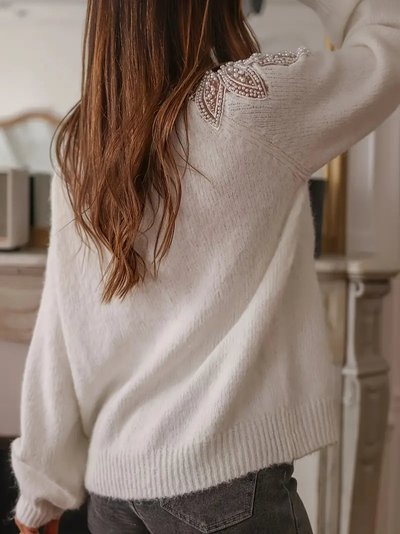 A soft knit with delicate pearl and lace detailing inspired by frozen petals in winter light. The gentle texture feels smooth against the skin, offering warmth without weight. Subtle sheen from the beadwork brings quiet contrast to the matte knit base. Designed to stand out softly, it carries a sense of calm luxury through the season.